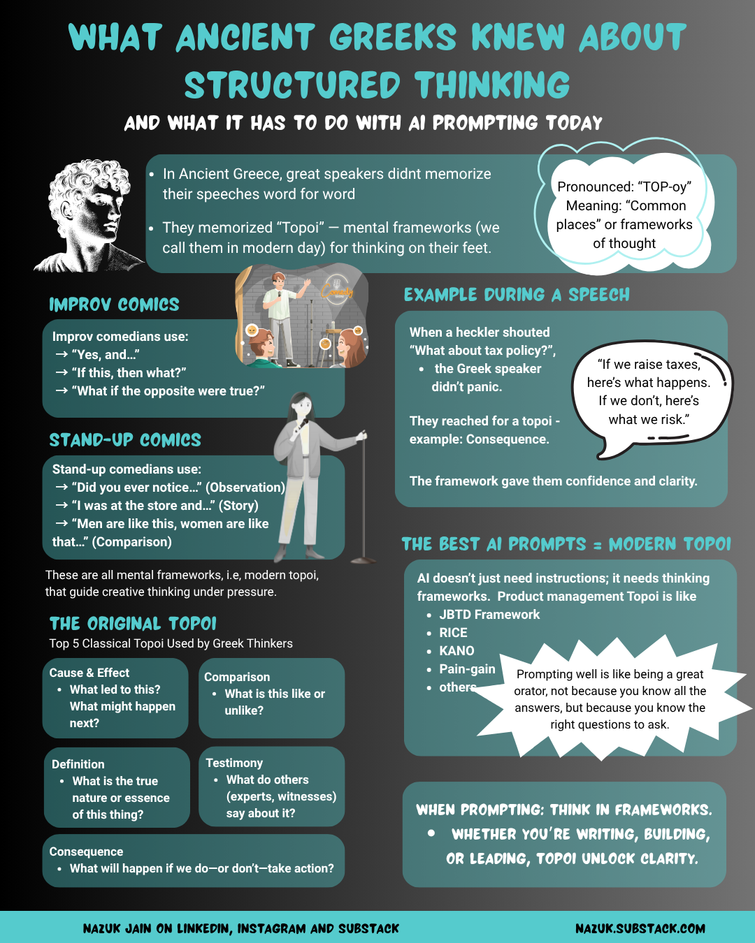 You know how improv comedians can be hilarious on the spot? They're not memorizing jokes they're using frameworks. "Yes, and..." for building on ideas. "If this, then what?" for exploring consequences. "What if the opposite were true?" for finding absurdity.